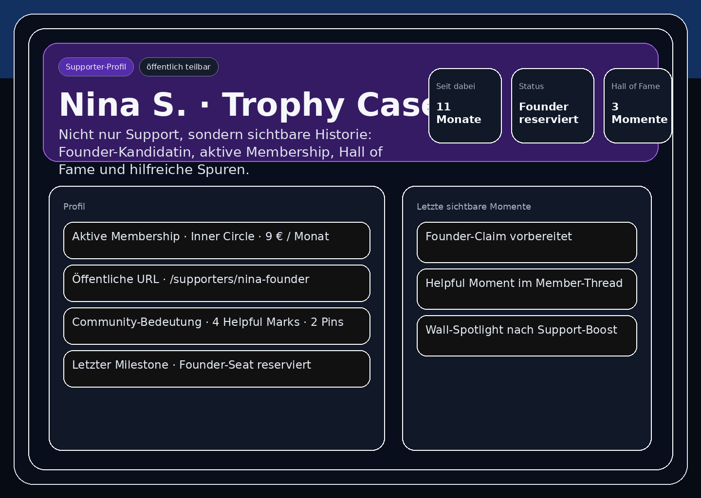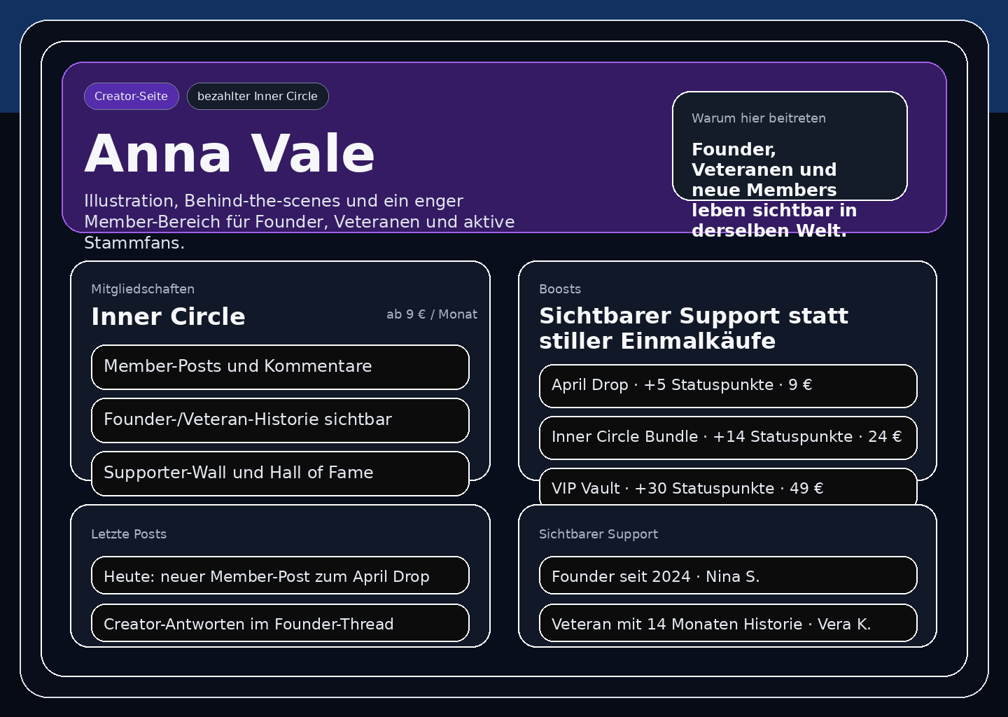 Der öffentliche Launch kommt später. Aktuell arbeiten wir mit wenigen Creatorn, die heute schon einen bezahlten Kern haben und Mitgliedschaft, Founder-Status, Historie und Community sauber zusammenziehen wollen.