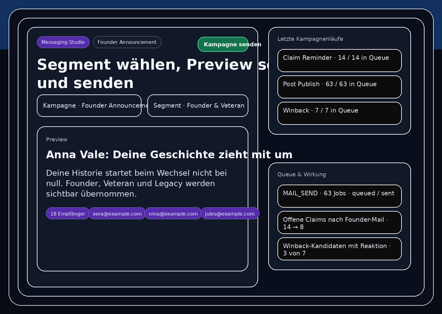 Founder Announcement, Claim Reminder, Post Publish und Winback mit Preview und Queue.
