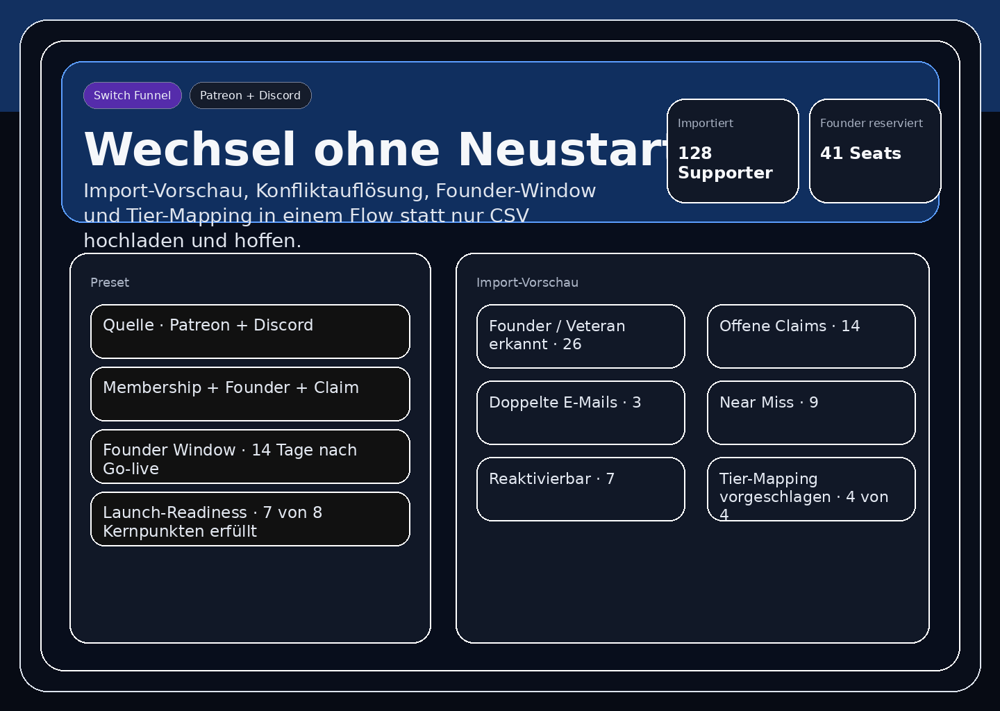 Import-Vorschau, Konflikte, Mapping und Founder-Window statt Neustart bei null.